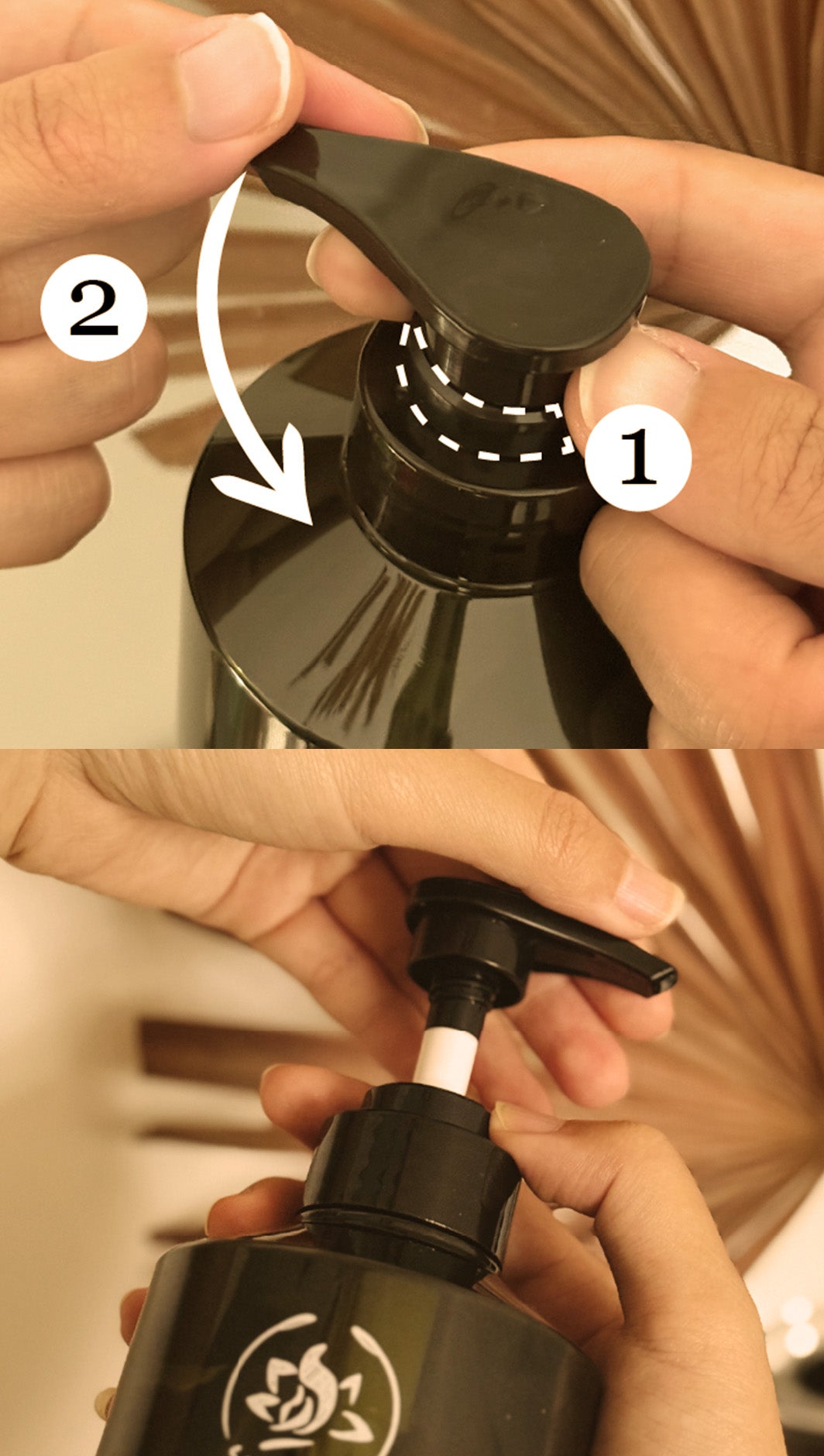 1. Hold the middle ring firmly; 2. Twist the pump head counterclockwise until it pops up and is ready for use.